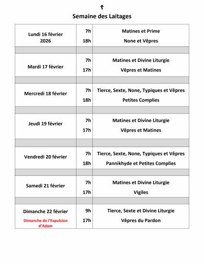 Le programme liturgique habituel du monastère est indiqué dans le tableau ci-dessous. Le feuillet liturgique qui est à télécharger donne plus de précisions sur le programme du mois courant. Cependant, des changements d'horaires sont possibles. Il est prudent de se renseigner à l'avance.