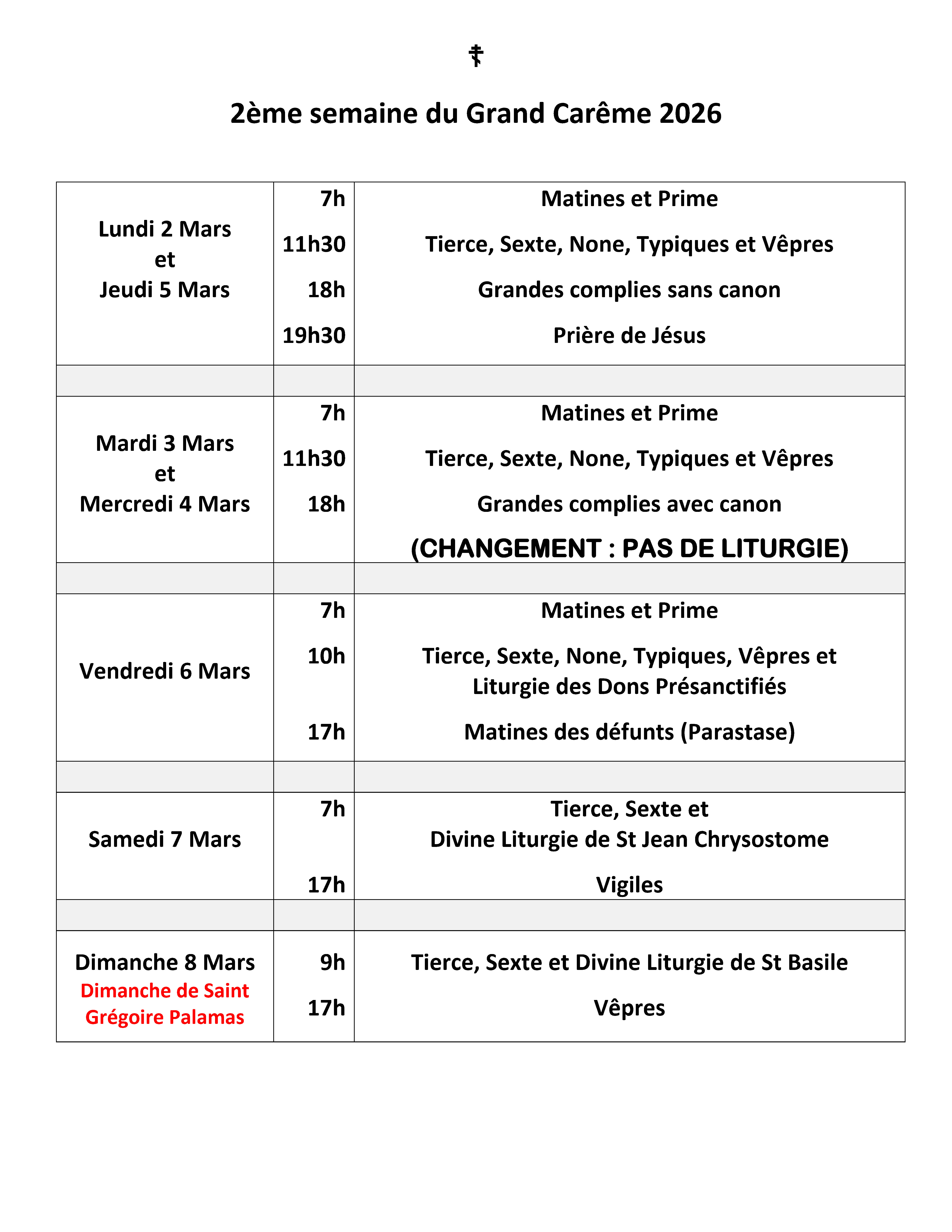 | Jeudi | 7h (à confirmer) 18h 19h30 | Matines et Divine Liturgie 9ème heure et Vêpres Office de la prière de Jésus |